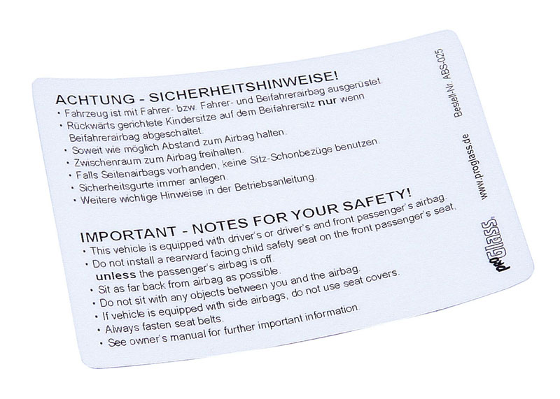 Almost every vehicle manufacturer has its own stickers with airbag warnings for the windshield. Our sticker saves you the time-consuming procurement of various stickers. The universally applicable airbag sticker made of transparent self-adhesive film is suitable for all cars with driver airbags, driver and front passenger airbags and side airbags.