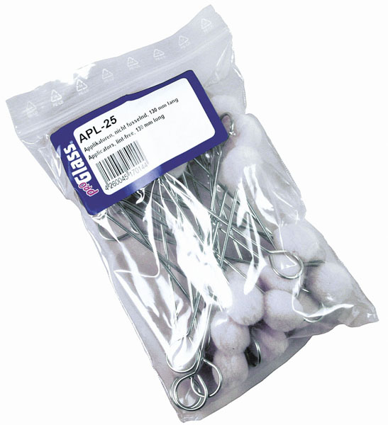 Cotton applicators (wool wiper) for the clean, precise application of black primer, primer, adhesive cleaner, etc. Our applicators are manufactured in Germany and are made of pure, non-spun cotton. They are practically lint-free and have a full, densely tipped head, which results in an evenly covering application of material. With the new 130 mm long applicators, you won't get your fingers dirty so quickly! With their longer wire, they also reach right to the bottom of 250 ml bottles.